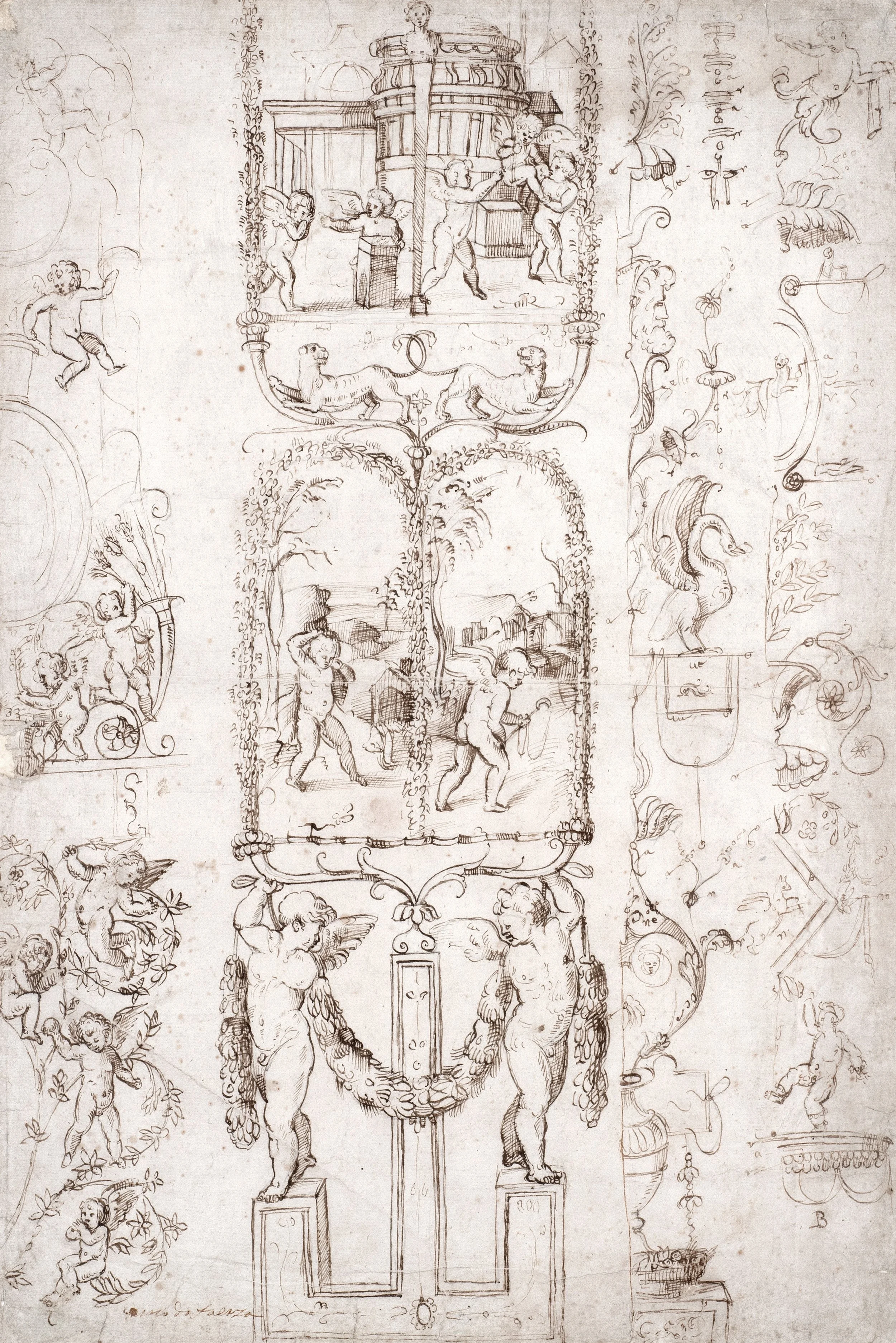 Nonesuch Gallery: Attrib: Giovanni Da Udine (Udine, 1487 - 1564, Rome), A Study For Part Of The Decorations In The Papal Loggie At The Vatican, pen & ink on laid paper, 40.6 x 20.7 cm (16 x 8 3/20 in)